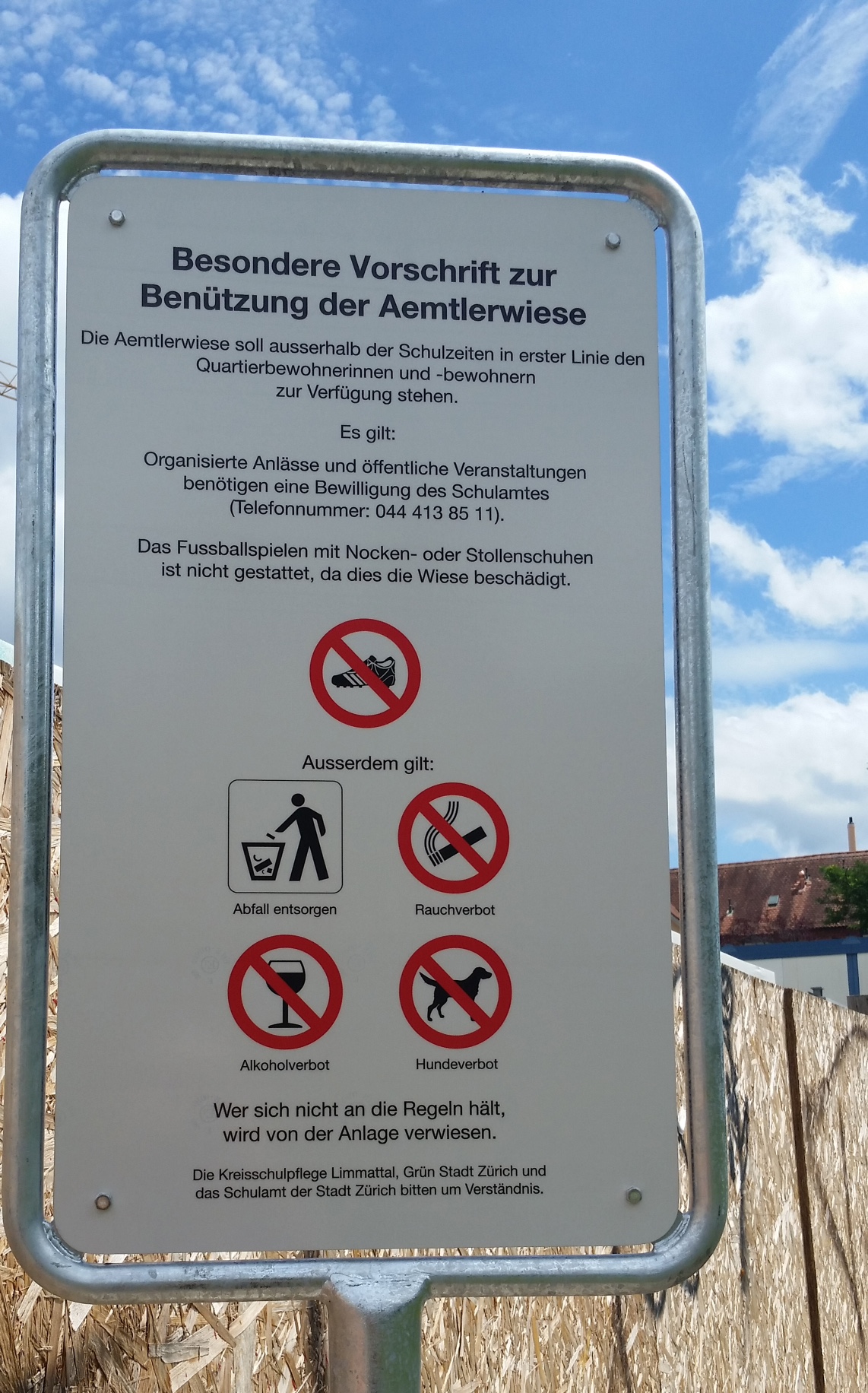 Anfang Juli wurde nun ein neues Schild aufgestellt in Absprache mit dem runden Tisch, an dem sich die Verwaltung und Quartierorganisationen (darunter das QN3) jeweils austauschen. Auf Wunsch des Quartiers verbieten fortan die Liegenschaftenverwaltung und Kreisschulpflege Limmattal das Betreten der Wiese mit professionellen Fussballschuhen. Im weiteren enthält es ein Hundeverbot (auf der ganzen Anlage gilt Leinenzwang), ein Rauch- und Alkoholverbot. Selbstverständlich gilt auch eine Abfallentsorgungspflicht.