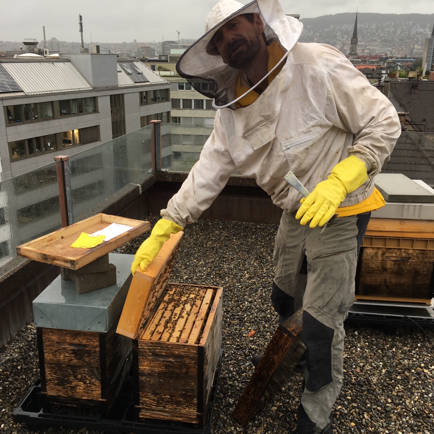 Die einfache Ausrüstung auf dem UBS-Dach, auf dem die Bienenhäuser stehen, mag manche wohlmeinende Stadtbewohner denken lassen, dass Bienenzüchten etwas Einfaches ist. Das Gegenteil ist wahr. Ein Imker muss die ganze Betreuung erlernen. Das heisst: seinen Sommer opfern, sich medizinisch um die Bienen kümmern und Unterstützung leisten, wenn eine neue Königin ihren Thron übernimmt. Bienen sind Tierschutzgesetz geschützt und müssen respektiert und gepflegt werden.