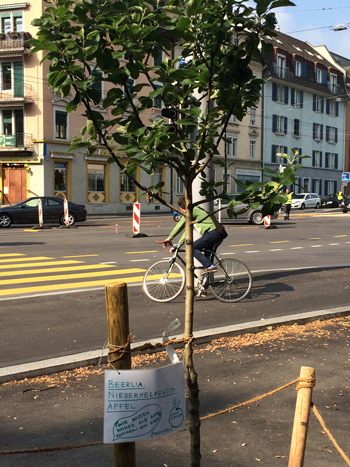 Auffällig sind die handgeschriebenen Tafeln: «Im Herbst darfst du meine Früchte ernten», heisst es auf der einen, die um einen Stamm hängt. «Wer giesst mich, bitte?», steht auf der anderen. Die vier Obst- und Nussbäume haben klingende Namen wie Winterrousselette, Franquette, Beerlia oder roter Ostercalvill. Wer denkt, dass dies nach einer besonders gelungenen Aktion von Grün Stadt Zürich aussieht, wird eines besseren belehrt. «Es war eine Guerilla-Aktion», heisst es von dort. Zwei ältere Damen vor dem Kafi Ferdinand erzählen, dass eines Nachmittags «eine Gruppe von jungen Leuten» dagestanden sei und die Bäume eingepflanzt hätte. Eine sympathische Aktion finden sie. Hinter der Aktion steht der stadtbekannte Guerillagärtner Maurice Maggi, der schon früher mit Gemüsebepflanzungen auf das Thema «Essbare Stadt» aufmerksam machte.